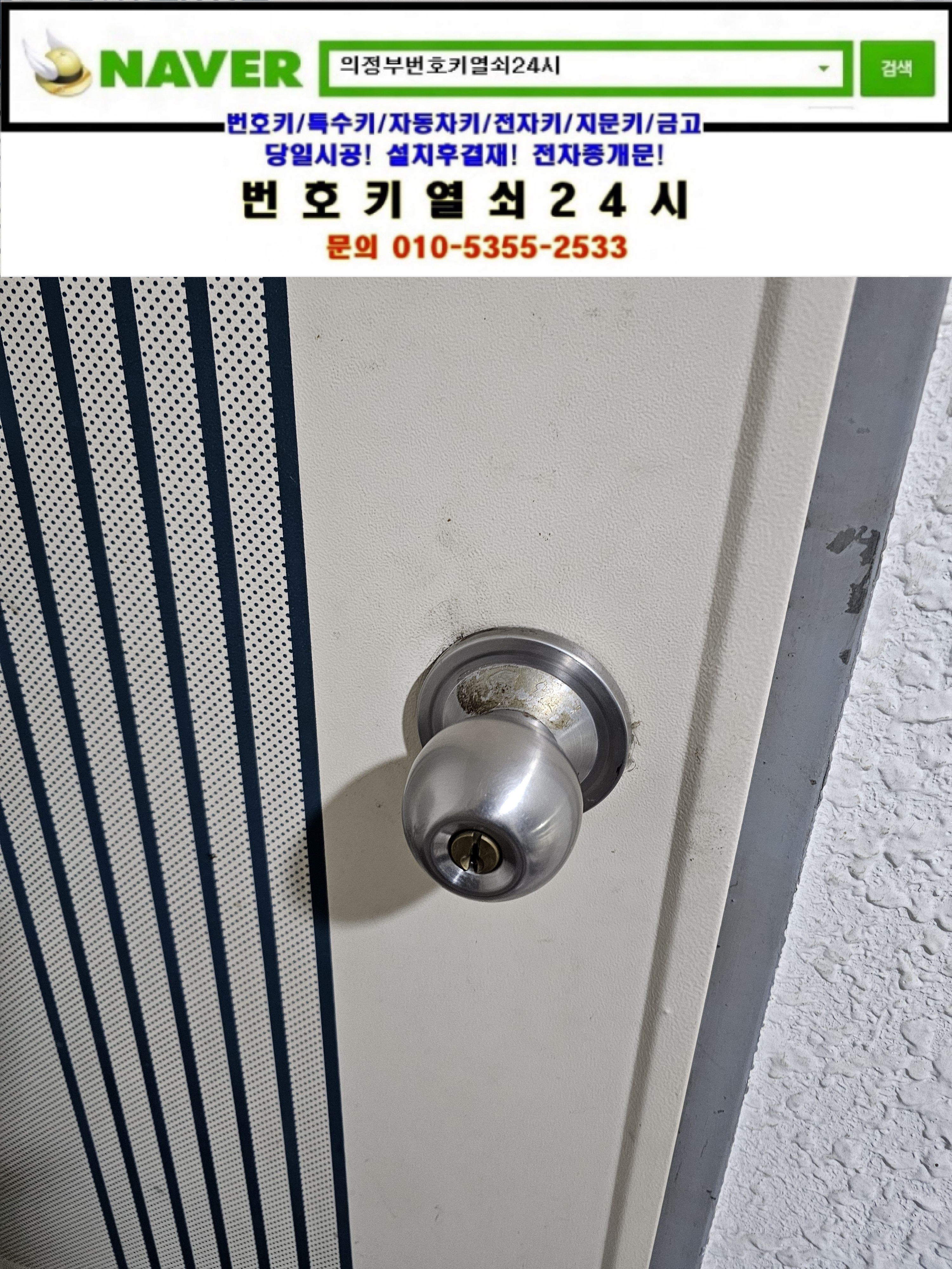 남양주시 별내면 청학리열쇠(청학로학교길 42-22) 쉐르빌빌라 현관문 원형손잡이는 번호키열쇠24시가(010 5355 2533) 설치하고 왔습니다.