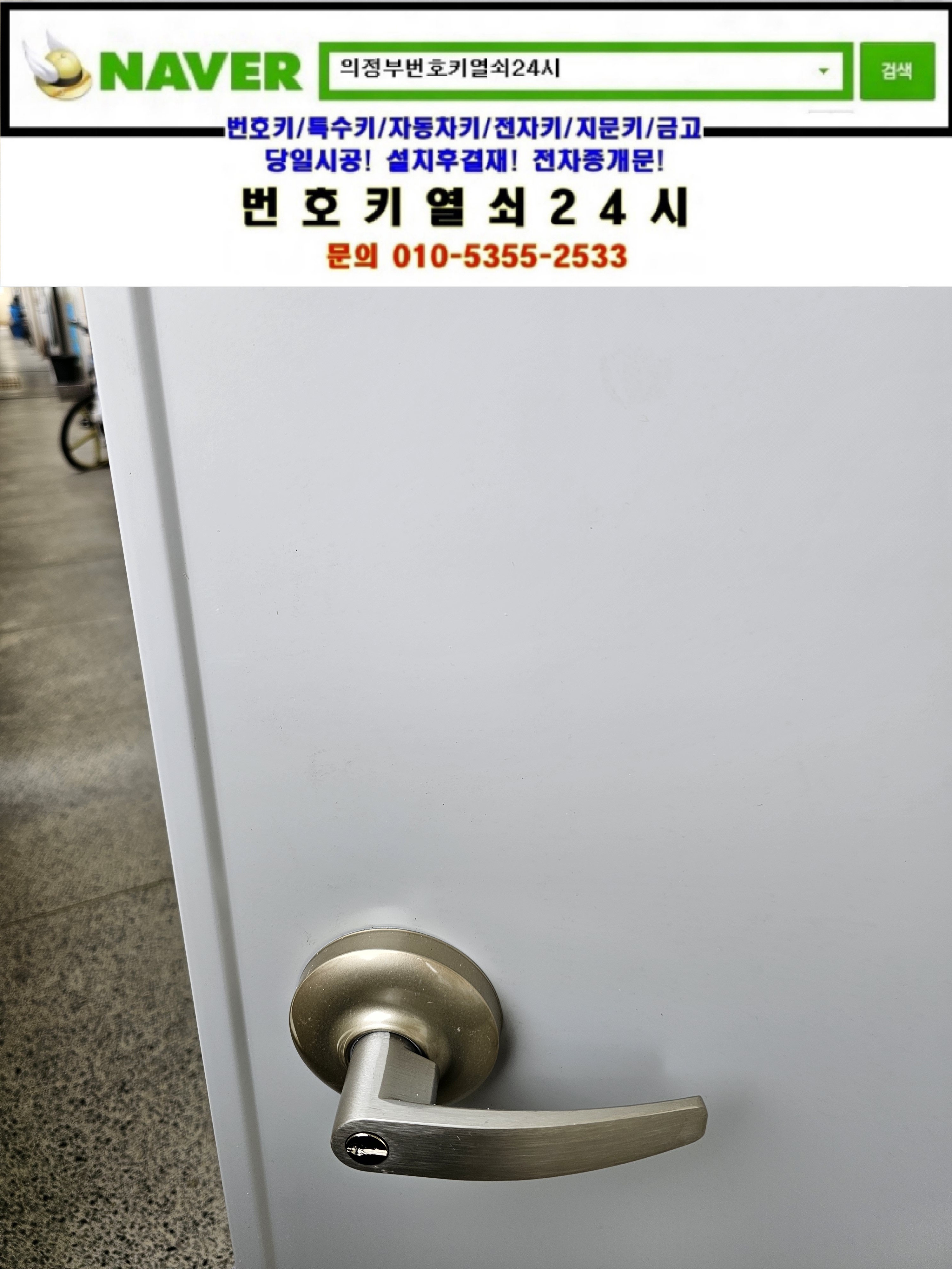 사장님 현관문열쇠를 설치하려고하는데요. 이게 구멍이 안뚫려있어서 설치해주시는데 비용이 얼마나하죠? 하면서 번호키열쇠24시를 찾으셔서 어디시며 어떤방식의 열쇠를 설치하는지 물어본후 비용을 안내해드리니 설치를 요청하셔서 현장으로가서 설치해드렸습니다.