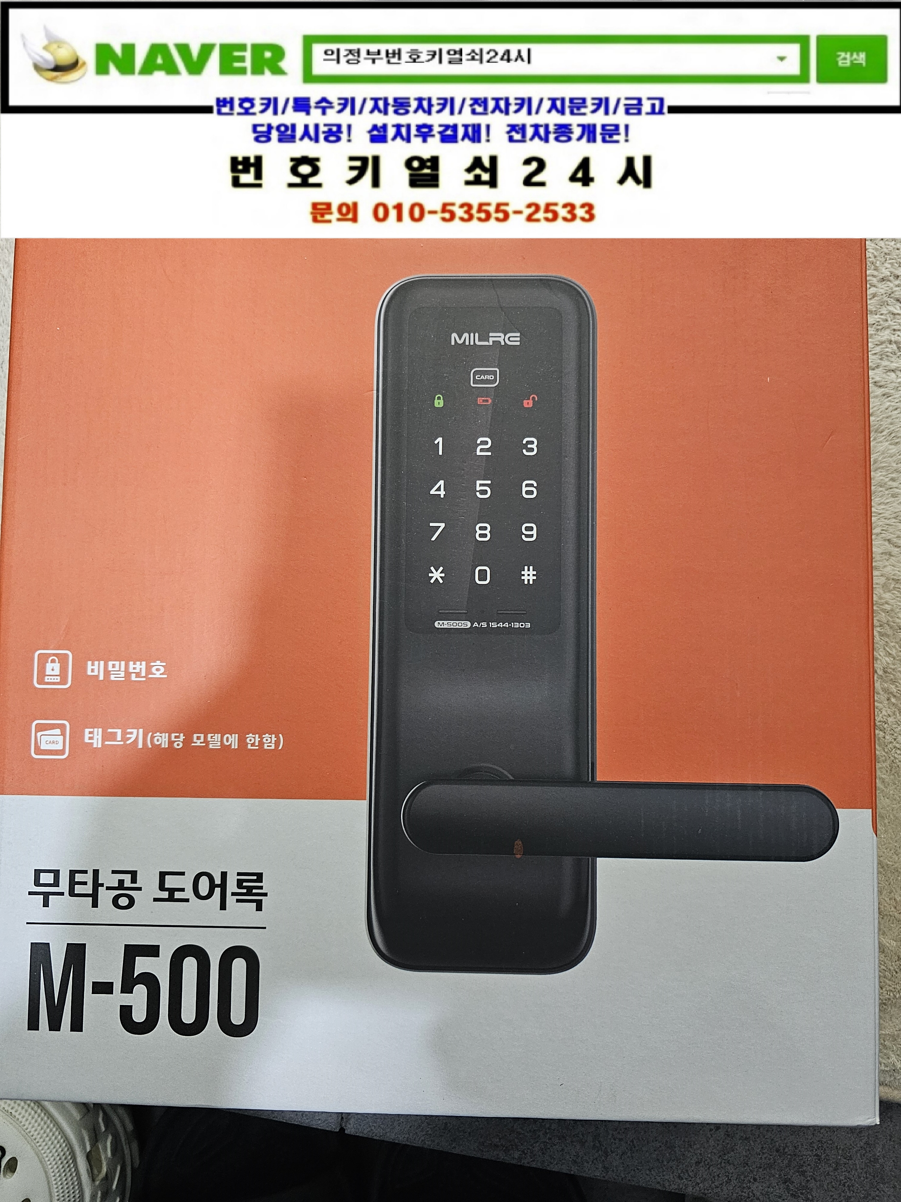 번호키를 설치하려고하는데요.비용이 어느정도하죠? 하면서 번호키열쇠24시를 찾으셔서 어디시며 어떤방식의 도어락을 설치할껀지 물어본후 설치할 제품링크안내를 해드니 설치를 요청하셔서 현장으로가서 보여드리고 설치해드렸습니다.