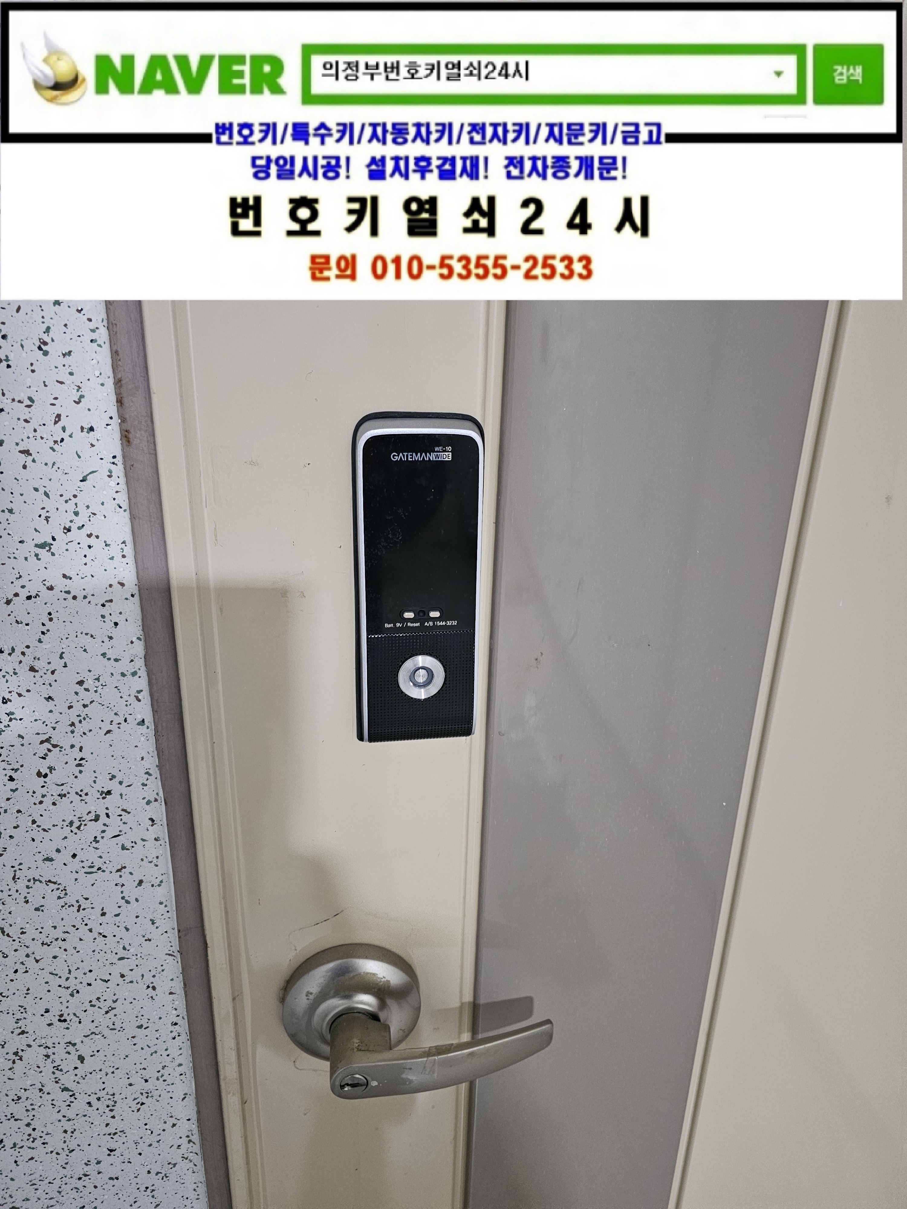 | [패션문카드키도어락/디지털도어락설치]문호리 일반주택 커버타입 카드키도어락은 번호키열쇠24시가 설치합니다. (0) | 2025.03.21 |