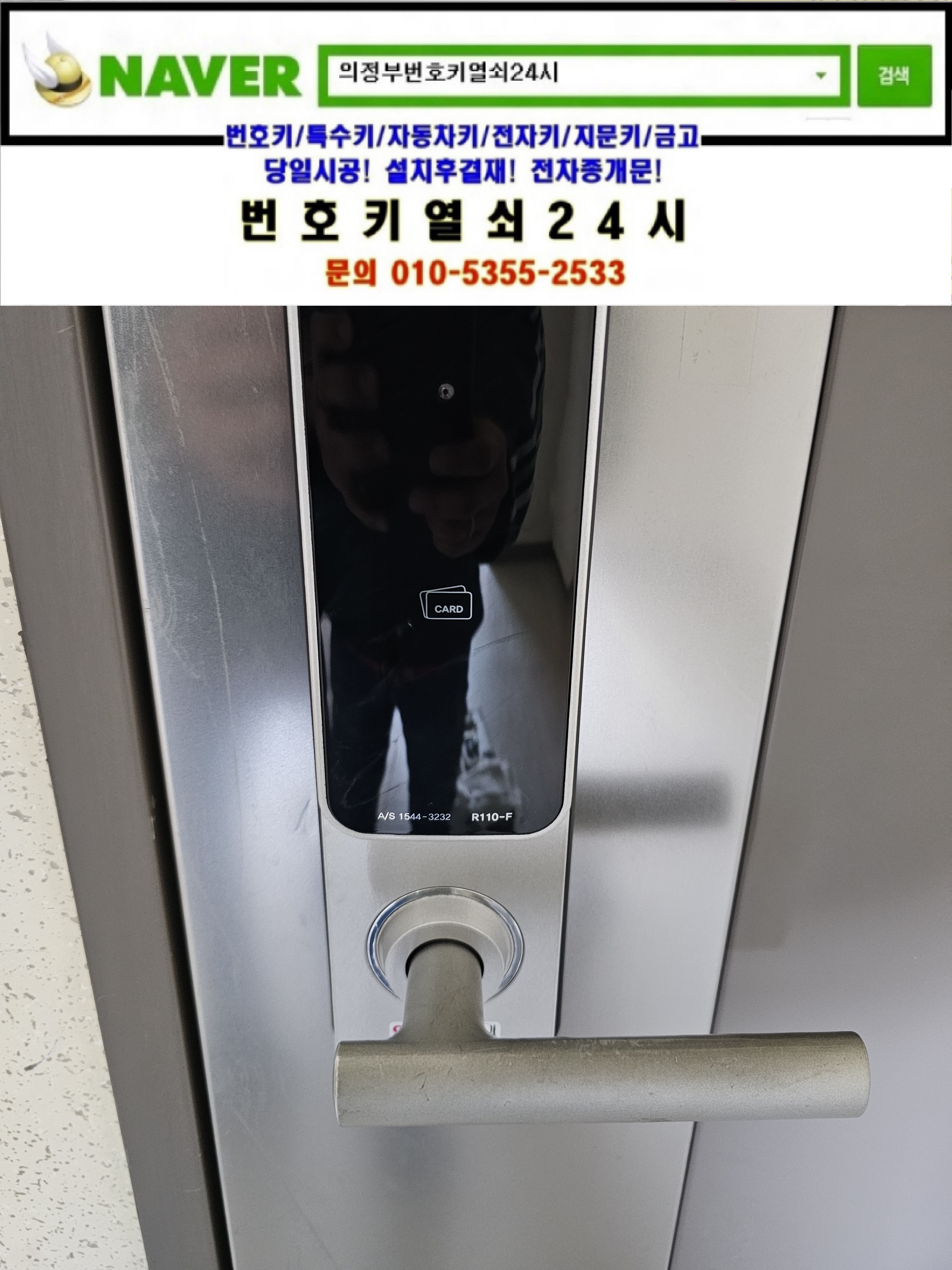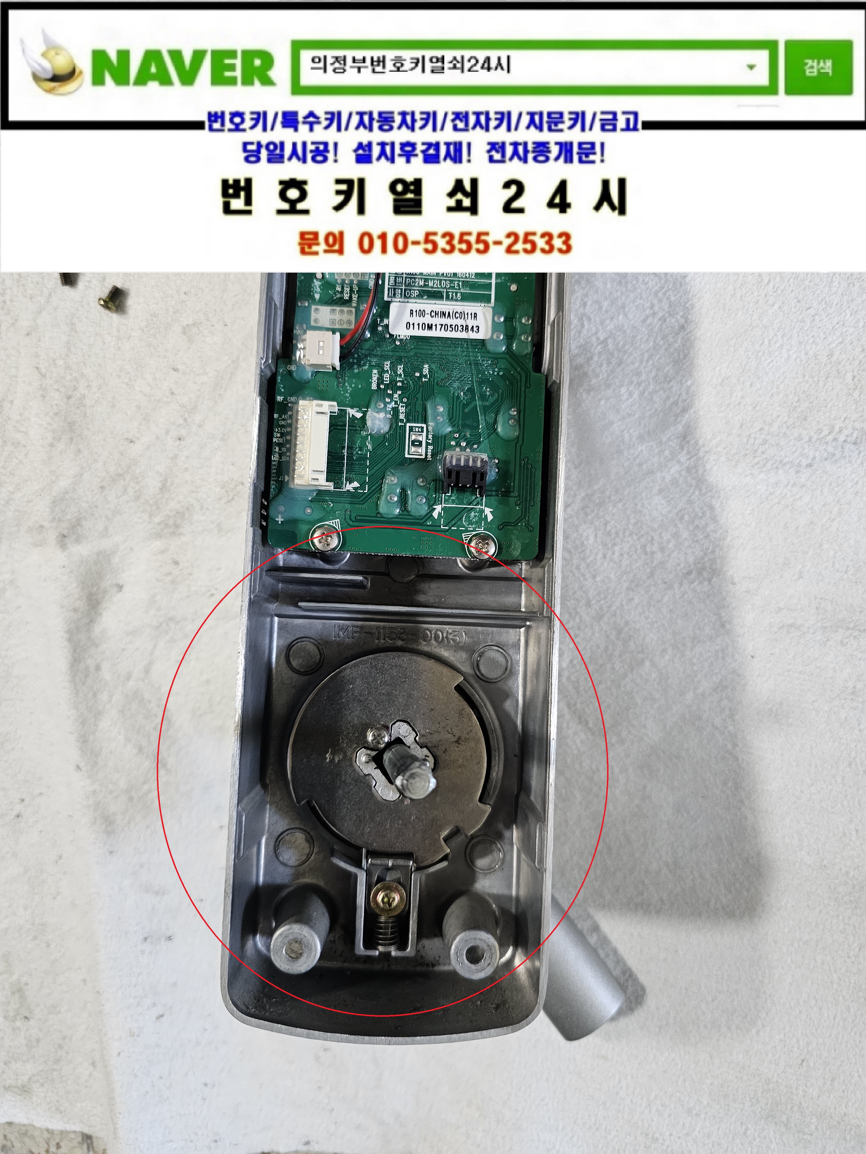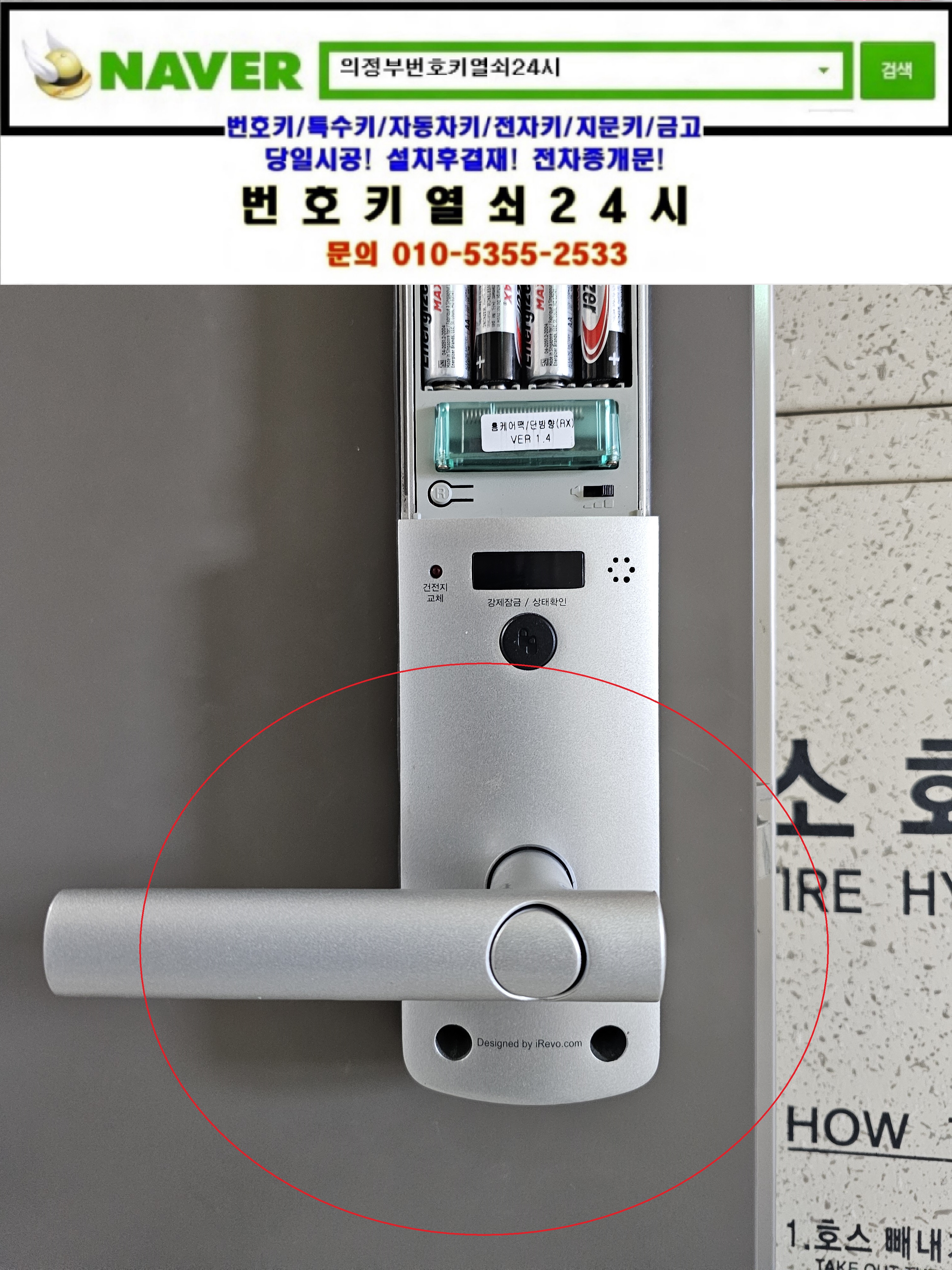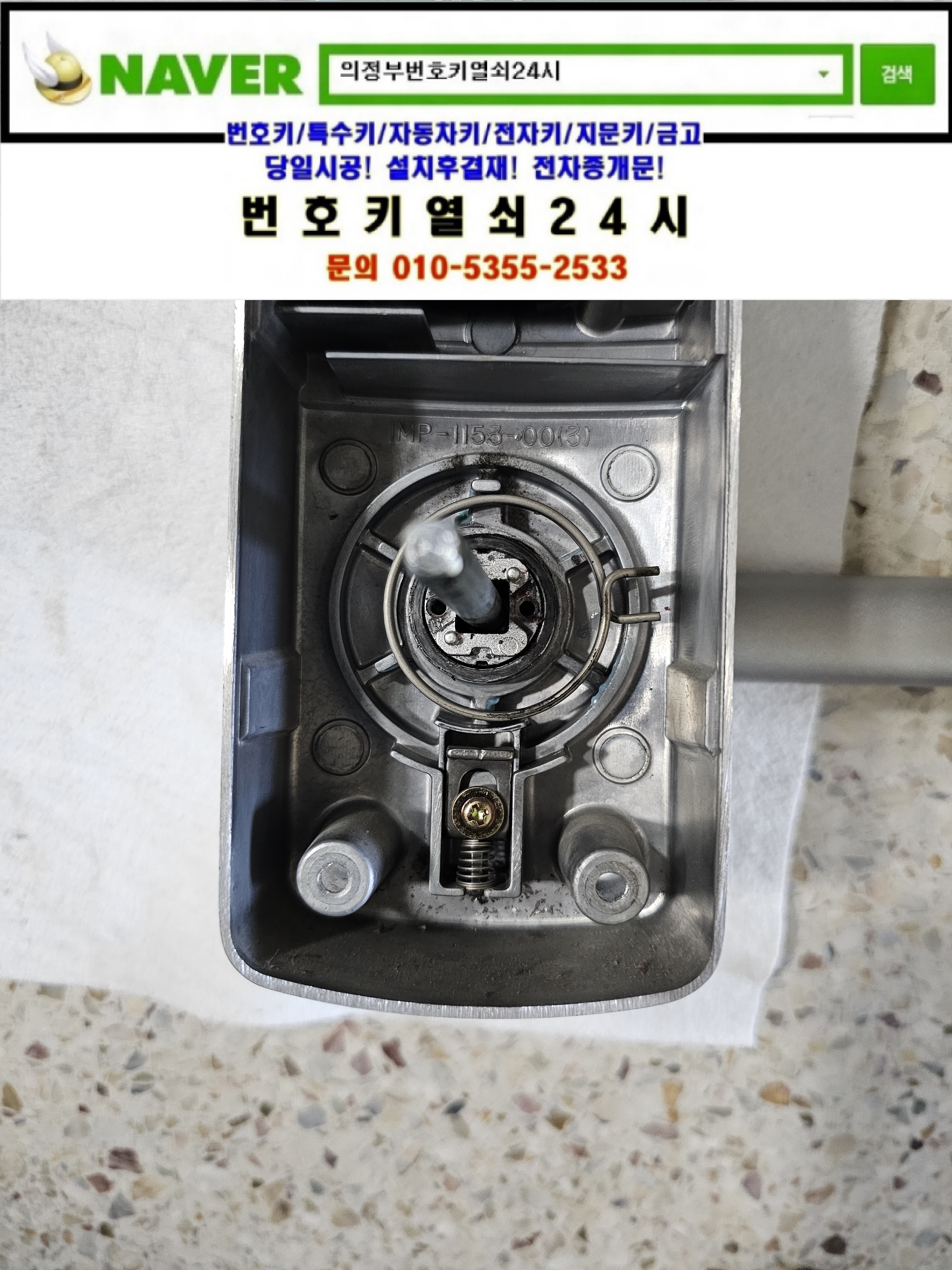 현장으로간곳은 의정부시 낙양동열쇠(민락2지구/송양로93) 민락2지구 18단지 호반베르디움아파트입니다. 고객님댁의 게이트맨주키 R110-F 레바주키도어락 안쪽레바가 아래로 쳐져있어서 디지털도어락을 탈거한뒤 부품을 제조립한뒤 정상작동확인과 디지털도어락특징등을 설명드리고 철수합니다.tel:010-5355-2533