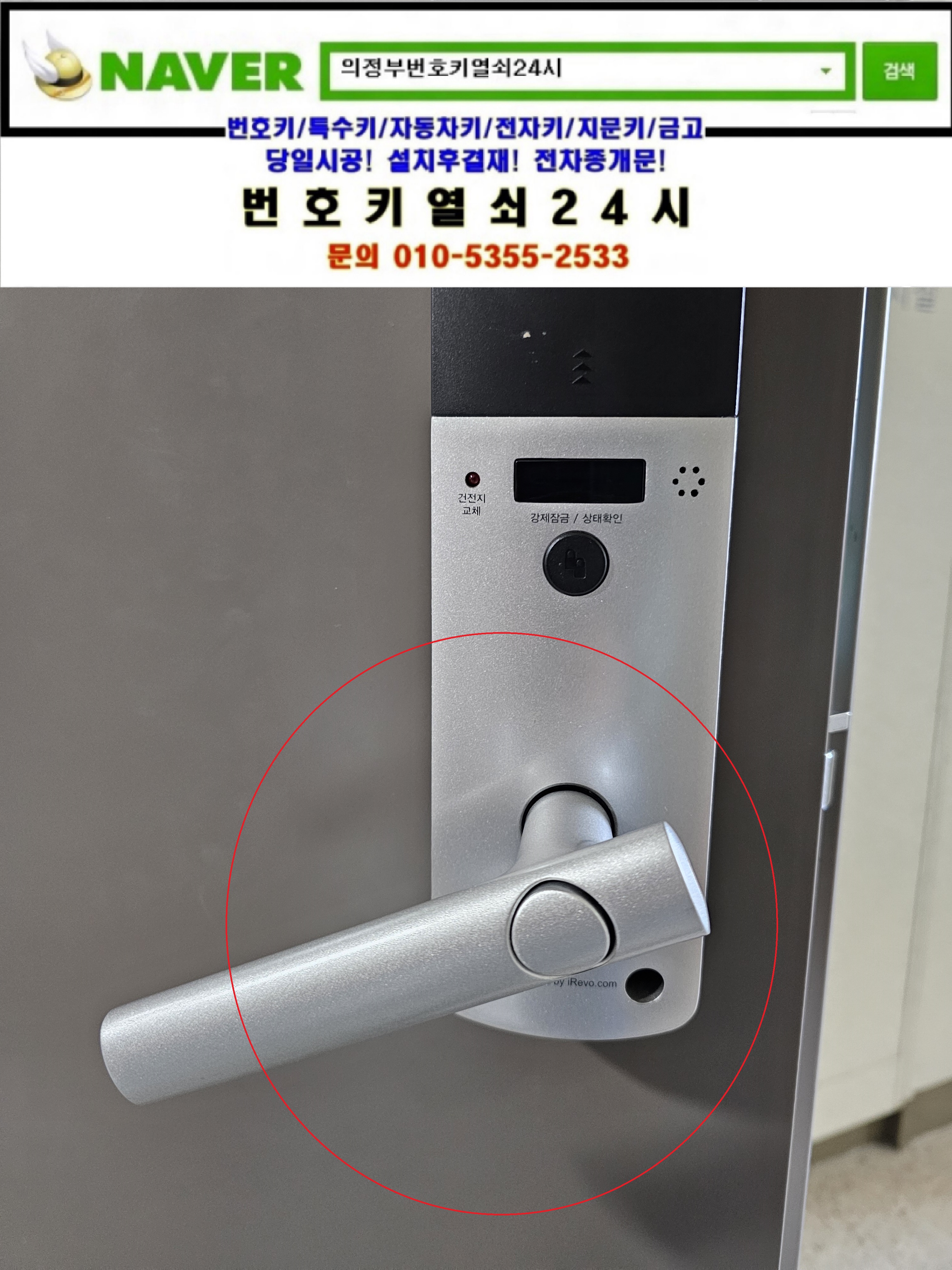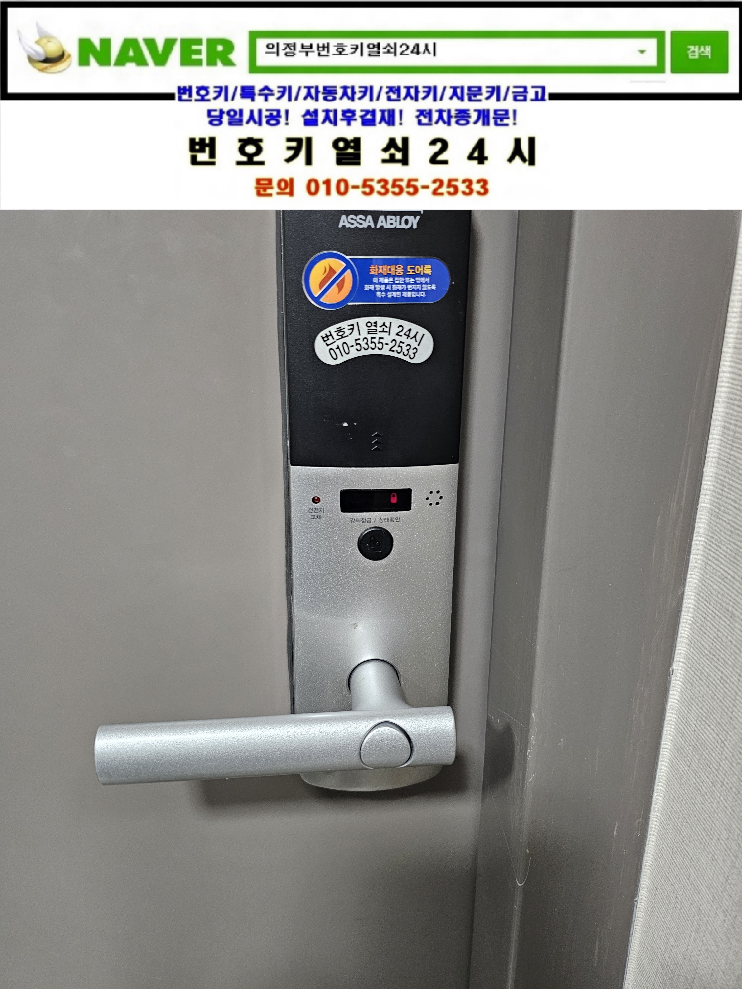의정부시 낙양동열쇠(민락2지구열쇠/송양로 93) 민락2지구 18단지 호반베르디움3차아파트 게이트맨주키도어락 레바손잡이 쳐져 문고리출장수리는 번호키열쇠24시가(010 5355 2533) 해결하고 왔습니다.