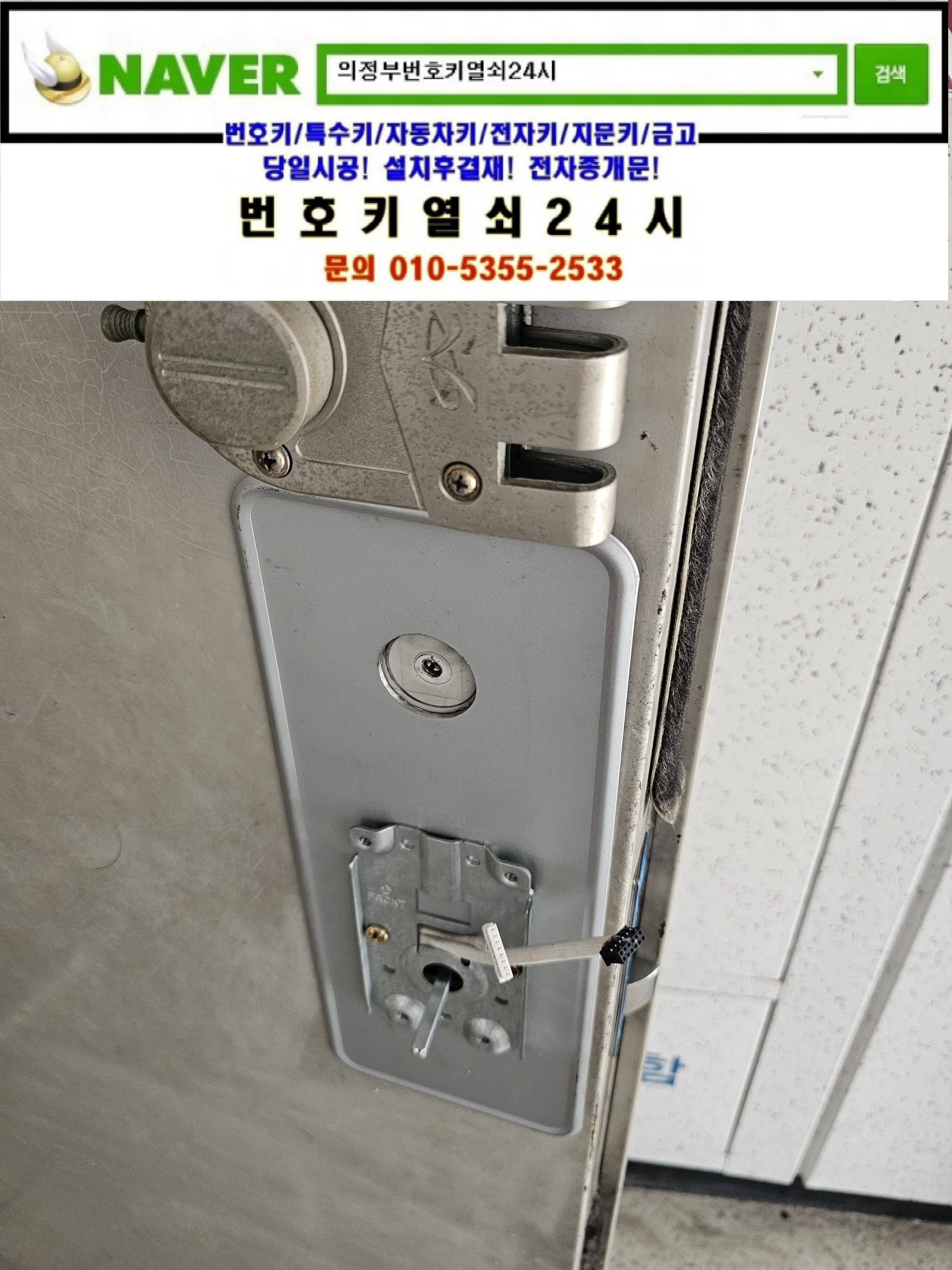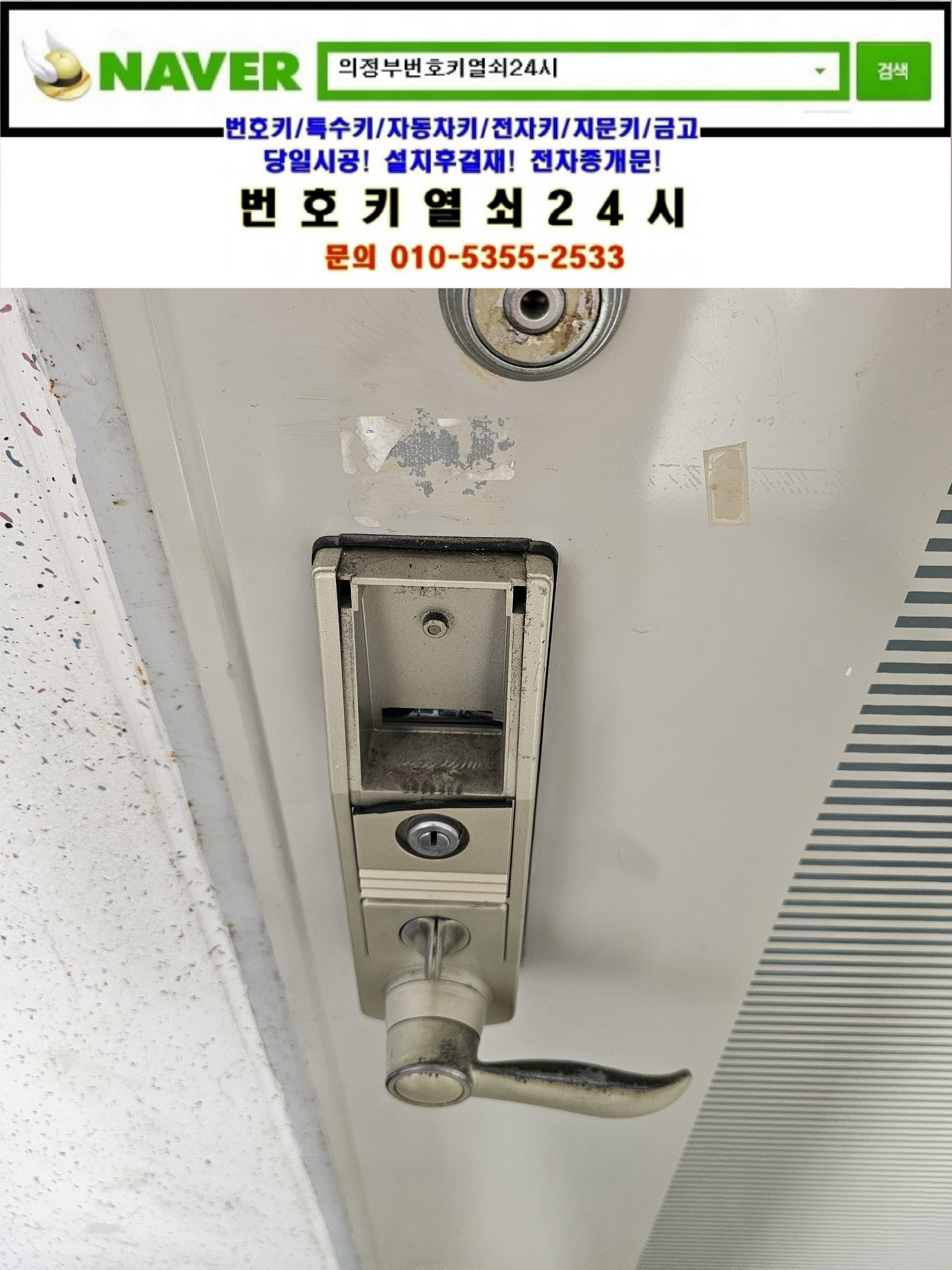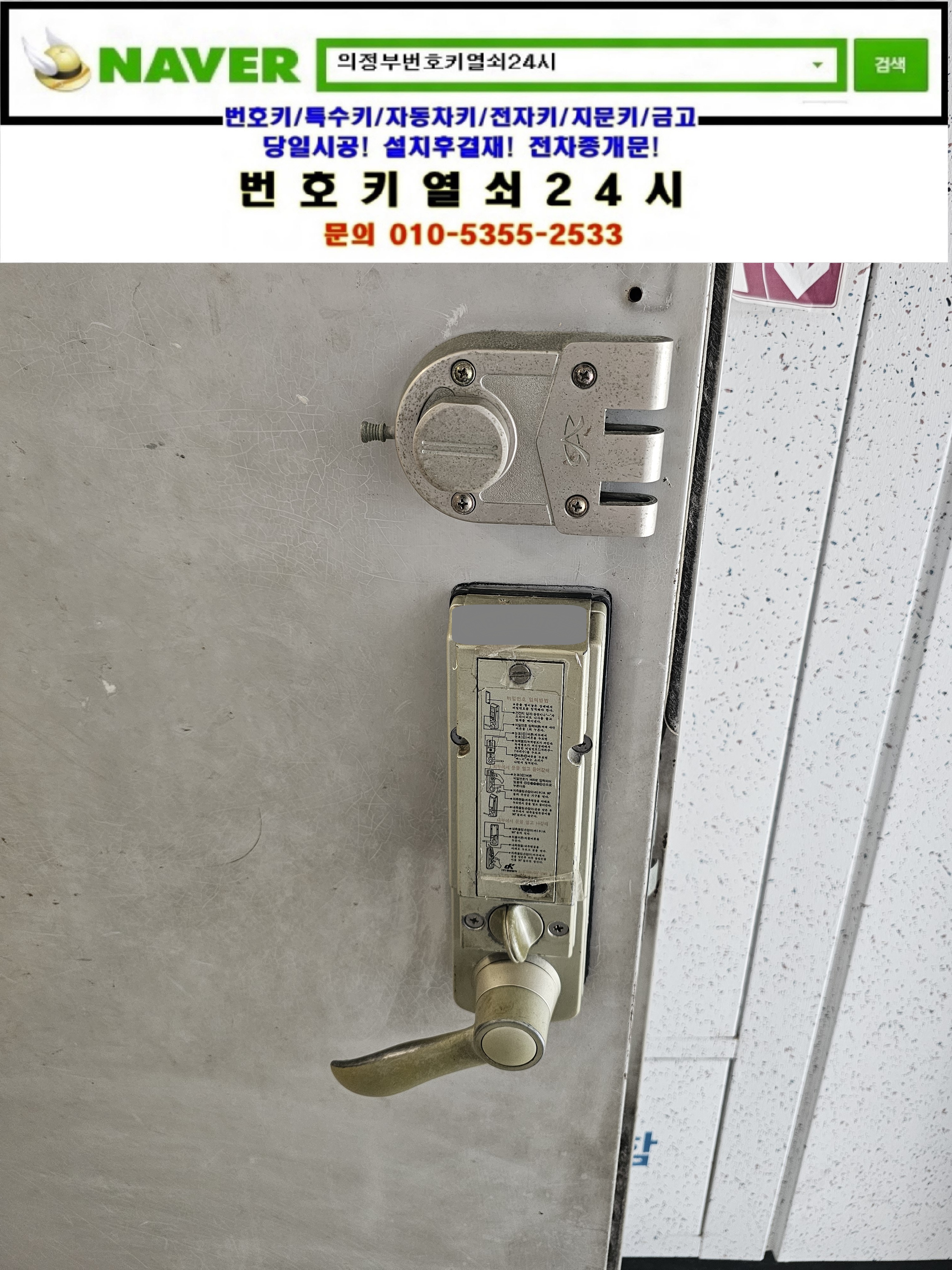 안녕하세요! 혹시 지금 출장가능하세요? 밧데리가 없어서 문 못열어서요하면서 번호키열쇠24시를 찾으셔서 9v건전지를 안내해드리니 오래돼어서 안된다고 교체를 해야한다고 사진을받고 교체설치할 제품링크를 보내드리니 m500모델을 설치원하셔서 현장으로가서 설치해드렸습니다. 현장으로간곳은 양주시 삼숭동열쇠(부흥로2096) ts푸른솔아파트입니다. 고객님댁의 노후된 동광알파도어락이 고장이나서 일부파손도되어 교체를 하신다고하셔서 집에를 못들어가셔서 신분확인후 디지털도어락을 파괴해서 개문한뒤 고객님께서 선택하신 모델 m500을 설치한뒤 비밀번호 설정방법 비상시 9v사용방법 디지털도어락사용시 주의사항등을 설명드리고 명함을드린뒤 철수합니다.tel:010-5355-2533