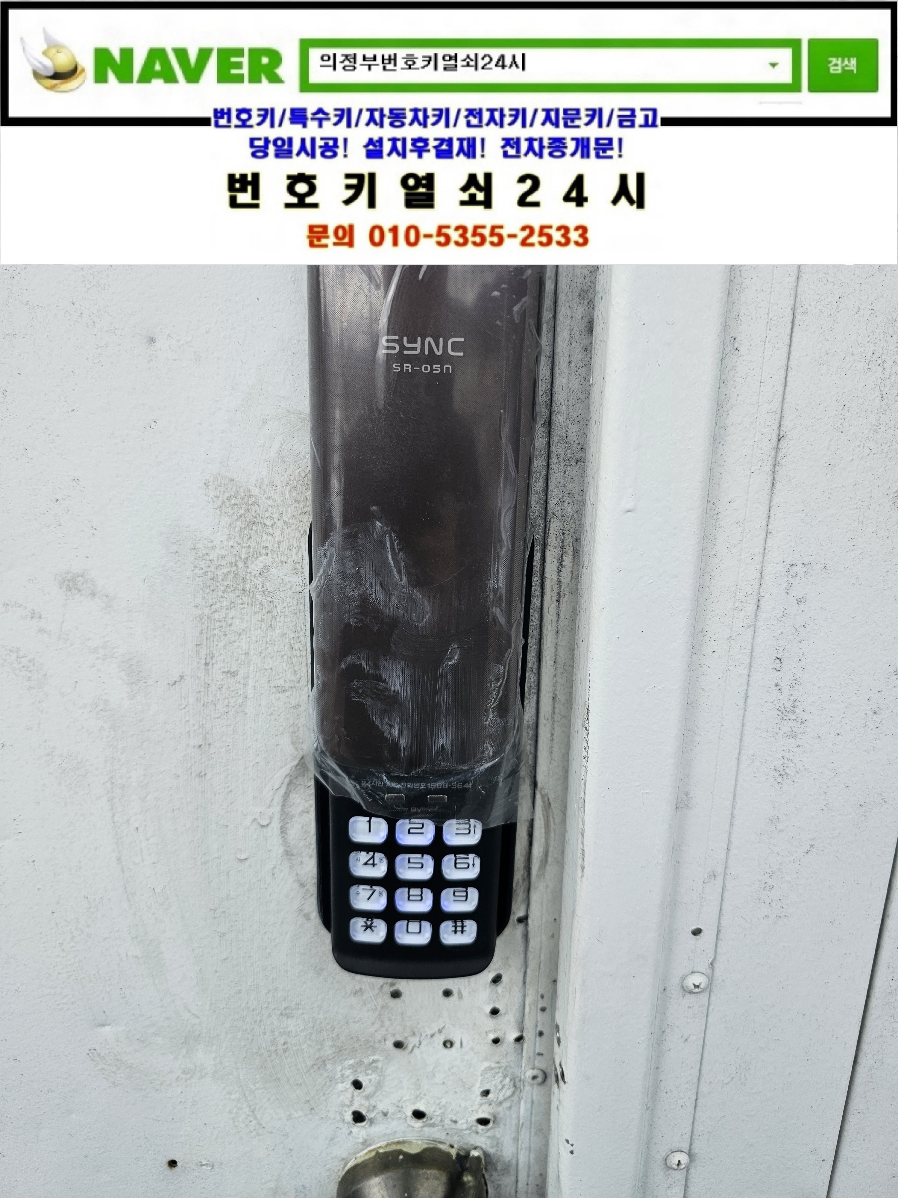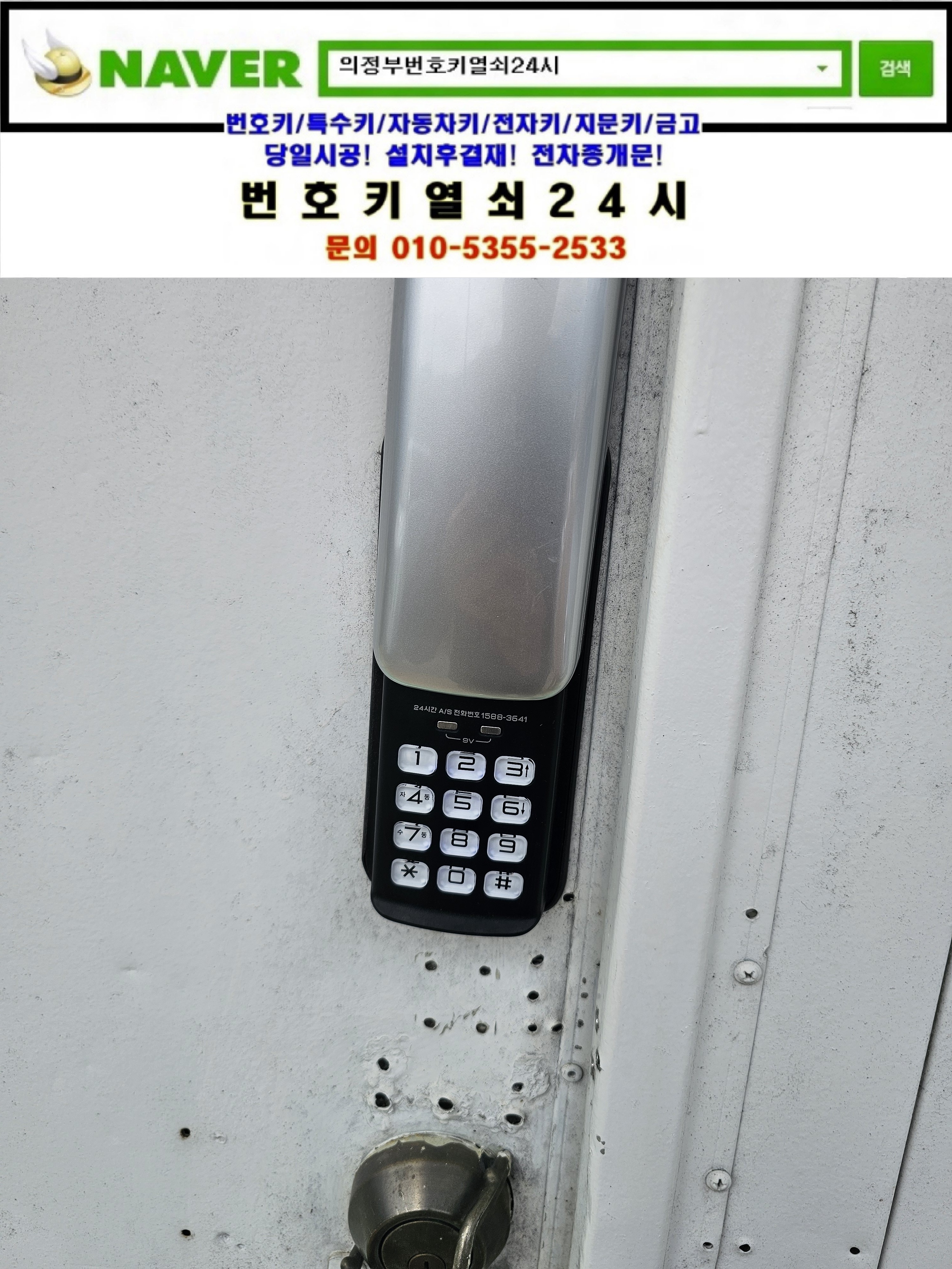 현장으로간곳은 남양주시 진벌읍 진절리열쇠 **빌딩건물입니다. 디지털도어락이 안되서 전화를 드렸다고 ㅠㅠ 현장상황을 확인해보니 디지털도어락 비밀번호를 바꿔놓고 전화도 안받고 계약은 끝났다고하시네요 ㅠㅠ 고객님 신분확인후 디지털도어락을 파괴해서 개문한뒤 보급형도어락 sr05n 설치해드리고 비밀번호 설정방법 디지털도어락사용시 주의사항등을 설명드리고 철수합니다.tel:010-5355-2533